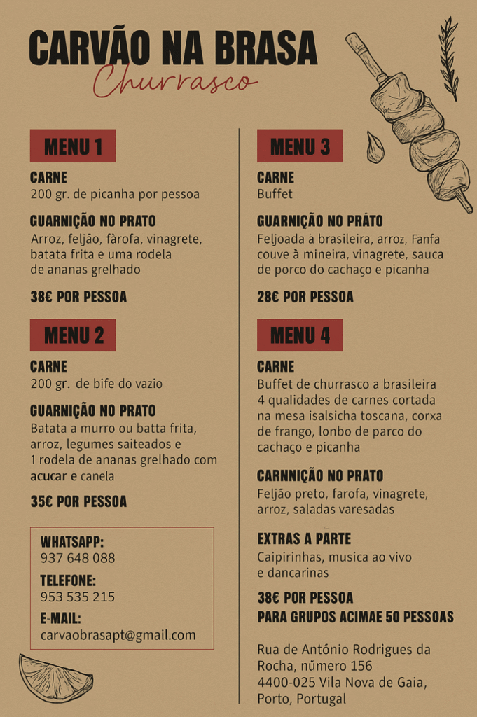 A Carvão & Brasa oferece menus completos com carnes selecionadas e acompanhamentos tradicionais, ideais para eventos de todas as dimensões.